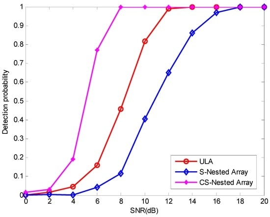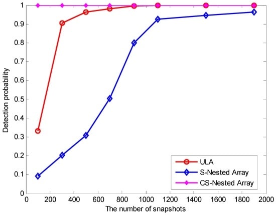 Figure 6 illustrates the detection probability of the three methods as a function of the number of snapshots, where the parameter are kept the same as before except SNR = 25 dB and . From Figure 6, it can be clearly observed that, the proposed method based on CSNA outperforms the two other methods due to higher DOF.
