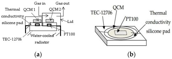 As shown in Figure 1a,b, the core of the assembled sensitive structure consists of two QCM wafers. They are 13.98 mm in diameter with 13.98-mm-diameter outer and 6.0-mm-diameter inner electrodes. Slightly different frequencies were chosen for the two crystals in each probe to minimize internal interference. Two PT100 temperature sensors were glued onto the cold surface of a refrigeration device. Unlike mounting a copper metallic O-ring [] or spring [], two circles of thermal conductive silicone pads are stuck along the outer edge of the PT100 sensors, and the outer edge of the DQCM is bonded to the thermal conductive silicone pads to seal the lower surface, which benefits the uniformity of the heat transfer and shortens the response time of the dew point. Moreover, the hot surface of the semiconductor refrigerator piece is pasted to a water-cooled radiator to ensure more efficient refrigeration. Two electrode leads of each QCM are fixed in the outside and connected to a frequency sweep generator through a relay. After wiring and testing, QCM2 and QCM1 are covered by lids with and without breather pipes, respectively. The lid made from Teflon is fastened with screws externally. A gas channel passes through the upper surface of QCM2, yet there is no gas exchange with the external environment for QCM1. Considering that little remaining gas still exists on the upper surface of QCM1, extremely dry gas with a humidity of 3% is pumped into a hole that was drilled through the lid at the start of the measurement so that water condensation will not appear on the upper surface of QCM1 in a large temperature range.