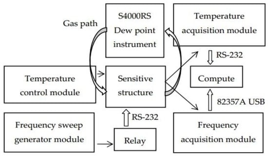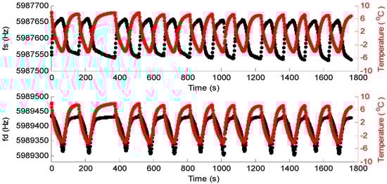 The most popular mass sensor, known as a quartz crystal microbalance (QCM), is a very stable and sensitive device, and its applications have extended to biochemistry, environmental monitoring, explosives detection, and intrusion detection [,,]. Recently, the QCM has been used as a humidity sensor [,,,]. One of the potential problems about QCM-based sensors is their cross sensitivity to thermal fluctuations, which can seriously compromise sensor accuracy [,,,]. It is a common issue in applications where the QCM is used for in situ sensor measurements in dynamically variable environments [,], where the sensor often operates over a wide temperature range. In such situations, the sensor readings will be superimposed with the QCM’s temperature-induced frequency shifts, and this will cause measurement errors []. Therefore, temperature has become an important error source in the process of dew point calibration.