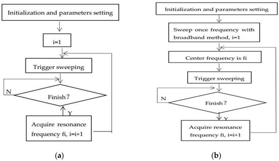 An impedance instrument has the function of a broadband frequency sweep, so the direct method of frequency measuring is a broadband method. A basic flow chart is shown in Figure 3a. In order to secure the largest range of sweeping frequency, δ must be properly set. However, over the long period of continuous measurement, it is difficult to master an accurate range, which leads to an inappropriate setting of the frequency’s bounds. There are two consequences to this: One is that, if δ is too narrow to cover the resonance frequency, the output frequency will be the upper or lower bound, and an error will occur. The other is that δ is set large enough to cover the resonance frequency, and γ may increase at the expense of extending the measuring time. In addition, a new frequency measuring method is put forward, which is called the narrow band method. The basic flow chart is as shown in Figure 3b. The approach of seeking the resonance frequency is that, firstly, with the broadband method, we sweep once and set it as the initial center frequency of sweeping. Then, in the loop measurement, center frequency will be replaced by each new measured .