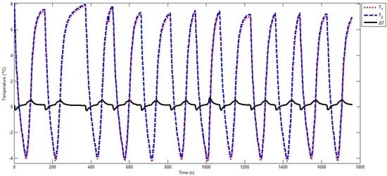 QCM1 is the reference crystal, QCM2 is the work crystal, and the measured temperatures via the two PT100 sensors are written as T1 and T2, respectively. Though the DQCM are cooled by a refrigeration device (TEC1-12706), the temperature gradient causes a temperature difference, denoted by ΔT. Figure 5 indicates that ΔT is within 0.5 °C; thus, the controlling temperature of the DQCM can be considered as constant. We took the average of T1 and T2 and named it T, representing the measured temperature. During each cooling period, we aimed to recognize the moment at which T and T0 were equal; at this point, Δf1 = fs − fd reflected the frequency characteristic.