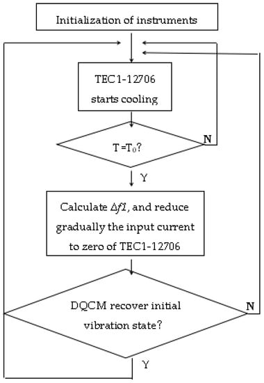 The purpose of continuous dew point calibration is to observe the relationship between the frequency difference of the DQCM and the dew point in many temperature circles. When T = T0, TEC1-12706 stops cooling, and it does not start cooling until the DQCM recovers the initial vibration state. The narrow band method mentioned above is adopted, and the frequencies of the DQCM are monitored in real time. The frequency difference of QCM1 and QCM2 is written as Δf, which is calculated by Δf = fs − fd, where Δf1 represents the frequency difference at the dew point moment and Δf2 stands for the frequency difference when the DQCM recovers the initial vibration state. A work flow chart is shown in Figure 6.