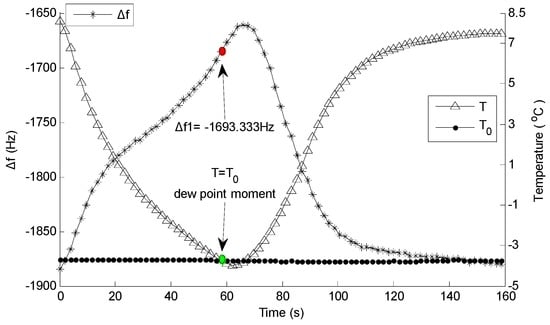 Figure 7 shows that the frequencies of the DQCM have a certain regularity with the change in temperature. On the one hand, the frequency of QCM1 increased gradually as temperature dropped, and decreased as temperature rose, but the overall range was within 120 Hz. On the other hand, the changing regularity of QCM2’s frequency was approximately the opposite. The frequency of QCM2 slightly increased and then decreased as temperature dropped, increased gradually as temperature rose, and then returned to the initial frequency. Figure 8 indicates that, Δf increased gradually as temperature dropped, and decreased as temperature rose. The point highlighted in green is the moment of T = T0, namely, the dew point moment, and the red dot represents Δf at that time, which is noted by Δf1. The calculated Δf in 11 groups of temperature cycles are listed in Table 1; the variation in the DQCM’s frequency difference as the dew point moment is reached, which is denoted by df, was calculated by df = |Δf1 − Δf2|.