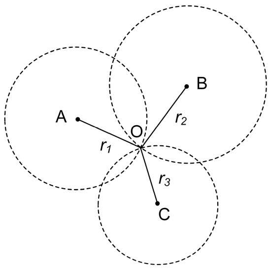 Figure 1 shows the location method of trilateration. The locations of the APs are represented by points A, B and C, of which the coordinates are measured in advance. The distances from the location of the target device (O) to the APs are represented by , and , which can be measured using the propagation model (model 1). Then, the coordinates of the target device are calculated using the least squares algorithm [42].