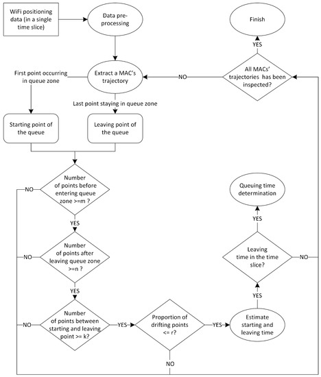 To estimate a crowd’s average queuing time, the optimal solution is to determine the queuing time of each individual. However, the time intervals of the trajectory points from our passive positioning system range from five seconds to several minutes, which results in incomplete queuing process records. In addition, the sample errors are not negligible. Therefore, sample reliability cannot be neglected, that is, more samples may not produce more accurate results. Therefore, similar to using a buoy to estimate the flow velocity of a river reach, a feasible solution is to identify relatively reliable samples acting as representatives [14] for queuing time estimation. To achieve this goal, when determining an individual’s queuing time, four parameters (, , , and ) of the trajectory are used. In practical applications, these parameters need to be tuned according to the site environment and hardware deployment. The estimation process is divided into three steps: (1) queuing process recognition; (2) parameter setting and queuing time determination; and (3) queuing time estimation.