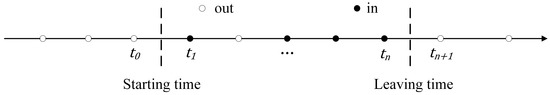 Figure 3 shows a queuing process in the time domain. The first point when an individual enters the queue zone is regarded as the starting point (point at time ), and the last point before leaving the queue zone is the leaving point (point at time ). The locations of the points at times and are taken as the starting and leaving points because all points before time and after time are outside the queue zone. These adjacent points indicate that the chance that they are drift points from the inside of queue zone is small. The frequency of packet delivery is affected by the WiFi module status of the mobile devices (e.g., “on” but not connected to WiFi APs, and “connected” but not using the network traffic). This is especially the case when the WiFi module is switched on but not connected to the WiFi APs, the device is only used intermittently, or the device has not been used during the queuing process. In these cases, the packet delivery frequency may be low and irregular. Thus, the points on the trajectory will be sparse and uneven. Therefore, the parameters defining the absolute number of points in each part of the trajectory are set to ensure the trajectory is eligible for analysis, i.e., at least points before entering the queue zone, points after leaving the queue zone and points from to (including points at times and ). Moreover, the locations determined by WiFi positioning may drift accidently (“drift phenomenon” or “drift weakness” hereafter, e.g., an individual inside a queue zone having positioning location outside the queue zone), which may lead to topological errors. To alleviate the impact of inside-outside drift phenomena (refer to Section 3.2), which causes obvious estimation inaccuracies, a parameter called the drift ratio () is required. The trajectory can be used to estimate the queuing time only if the proportion of drift points (empty circles between and in Figure 3) between time stamps and is less than the threshold. For available trajectories, we approximate the starting and leaving times of a queuing process as and , respectively, and the total queuing time as .