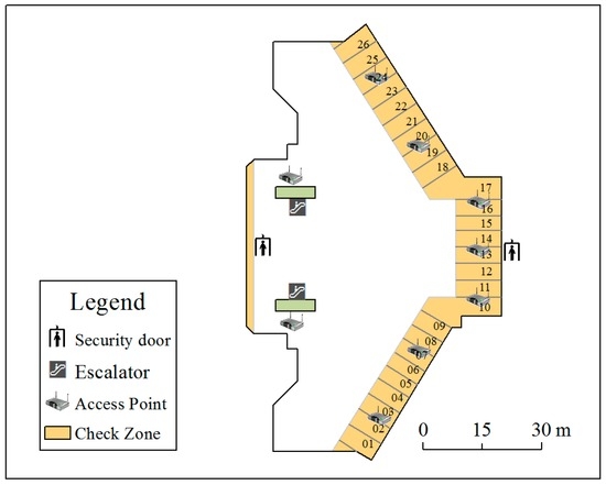 To validate our method, we designed a queuing time monitoring system at the T3-C entrance of Beijing Capital International Airport. The trilateration method was chosen for the positioning technique. In the deployment phase of APs, we aimed to minimize the systematic errors. Le Dortz et al. [45] verified that using more APs can help to improve the stability of WiFi positioning. Therefore, a greater number of APs improves the topological correctness. Regarding the topological relation, as the design of indoor positioning is an environment-dependent system because of the diversity of indoor environments, the experiment must be performed in situ. Under the condition of the largest number of APs, we test only a few deployment schemes due to the strict limitation in the security region. Specifically, in the T3-C security region, Beijing Capital International Airport, there are limited Internet access ports for the positioning system, and devices that affect the normal traffic and security check of passengers are not permitted. Therefore, we deployed the maximum number of APs according to principles mentioned in Section 2.2 and changed their locations among a limited number of positions allowed by the airport side. Finally, we installed nine APs in the queue zone whose locations are depicted in Figure 5. The seven APs on the right side were deployed inside the counters, and the two on the left were deployed near the escalator. We placed metal baffle plates near the border APs on the outside of the queue zone.