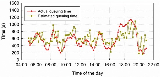 The statistical characteristics of the estimation errors are listed in Table 3. The mean queuing time from 11 August to 18 August was 546 s, while the estimated mean queuing time was 570 s. The mean absolute error (MAE) of the estimation results was 147 s, approximately 26.92% of the actual queuing time. On average, 25.39% of the absolute errors (AEs) were less than 60 s, 49.61% were less than 120 s, 69.20% were less than 180 s and 73.58% were less than 200 s.