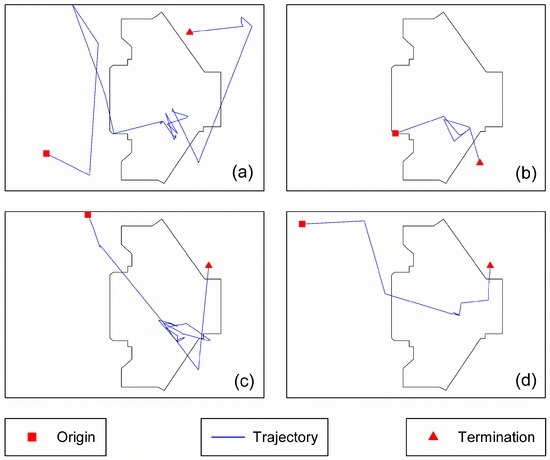 Passenger trajectory examples. (a–d) show trajectories of four different passengers in the T3-C Entrance.