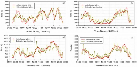 Comparison of the estimated and actual queuing times. (a) Comparison of the estimated and actual queuing times on 11 August; (b) Comparison of the estimated and actual queuing times on 12 August; (c) Comparison of the estimated and actual queuing times on 13 August; (d) Comparison of the estimated and actual queuing times on 14 August.