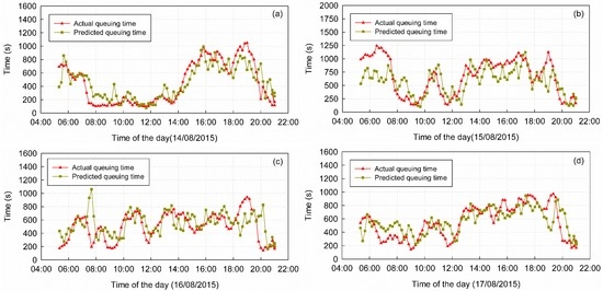 Comparison of the predicted and actual queuing times. (a) Comparison of the predicted and actual queuing times on 14 August; (b) Comparison of the predicted and actual queuing times on 15 August; (c) Comparison of the predicted and actual queuing times on 16 August; (d) Comparison of the predicted and actual queuing times on 17 August.