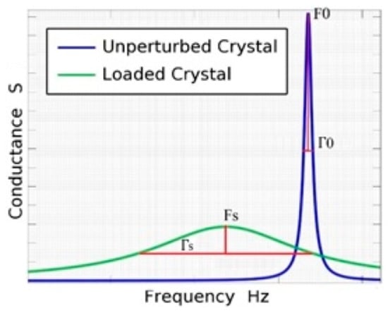 When the crystal is in contact with a mass or liquid, its resonance frequency changes according to two equations: the Sauerbrey equation for mass deposition (Equation (1)) [] and the Kanazawa equation (Equation (2)) for fluids []: