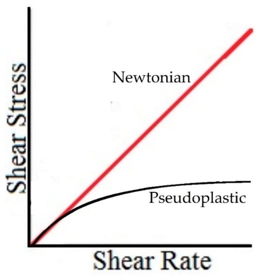 Additionally, it is not possible to compare the QCR measures with the viscometer measures directly because the pseudoplastic behavior is related to the shear rate. In other words, the apparent viscosity for pseudoplastic fluids (hyaluronic acid), defined as the slope of the curve in Figure 2, decreases when the shear rate increases []. For Newtonian fluids, it is constant. Figure 2 presents this phenomenon.