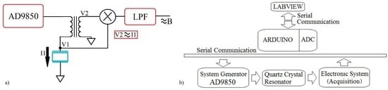 The quartz crystal has two electrodes, one on each side. The active electrode receives the sample on its surface and is connected to the electric ground to give more stability to the measures. The proposed circuit gets the voltage and current signal for several frequencies in a configurable bandwidth close to the crystal series resonance frequency (Fs). The circuit is a variation of the Nakamoto and Kobayashi proposal []. The electronic system includes a DAC (AD9850 module, Analog Devices, Norwood, MA, USA) to get a high resolution in the measures. The AD9850 module is capable of creating a sinusoidal signal of between 1 and 40 MHz with a frequency step of 1 Hz. The amplitude of the input signal in the crystal is 1 Vp. The sweep frequency is configured close to the resonance frequency of the quartz crystal to identify the expected behavior. The quartz crystal is placed in an array with a toroidal-core transformer used as a current sensor [,]. The secondary coil of the transformer gives a voltage proportional to the current in the primary which is the crystal current. The voltage is shifted 90° with respect to the original current signal. The voltage signal (V2) related to the current through the crystal (I1) and the voltage used to stimulate the crystal (V1) are multiplied by using an AD835 mixer (manufacturer) according to Figure 4a.