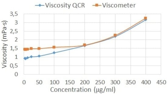 The results allow us to see the capacity of the prototype sensor to detect the viscosity samples in up to 6.3 mg/mL of the solution (limit of detection). Figure 6 shows the performance of the QCR biosensor vs. Fungilab Viscometer. According to the Figure 6, the Fungilab viscometer does not differentiate samples with a concentration lower than 5%.