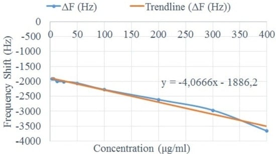 The proposed QCR prototype has a good performance. The results illustrate the capability of the QCR sensor to measure small changes in the composition of glycerol aqueous solutions. Figure 7 shows the relationship between the concentration of the sample and the sensor response ΔF. According to Figure 7, the sensitivity of the sensor is ≈ 4.06 Hz per 1 μg/mL concentration sample. The smallest incremental change of concentration that could be detected in the biosensor (resolution) was 6.25 μg/mL.