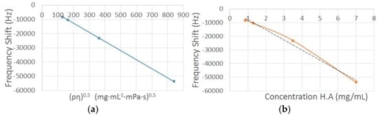 Figure 8 shows the response curve of the biosensor versus the square root of the density viscosity product (Figure 8a) and versus the concentration of hyaluronic acid in the samples (Figure 8b). The frequency shift shown corresponds only to the viscous component of the viscoelastic samples.