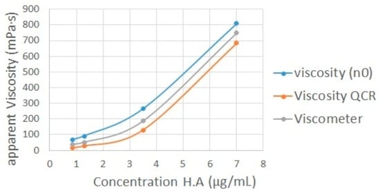The obtained results confirm the relationship between hyaluronic acid concentration and the viscosity of the fluid. Considering the concentration samples used in this study are very similar to the ones reported for arthritic diseases [,] and the results shown, the QCR biosensor would be capable of identifying synovial fluid samples (healthy or with any medical affectation).