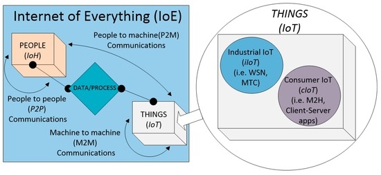In recent years, we have witnessed an exponential growth in the evolution and development of different communication technologies addressed to support the IoT. New applications require innovative connectivity solutions and new ways of sharing data among different devices and networks, thus creating a new concept of Internet. In the related literature, a collection of new terms have been coined in an attempt to clarify the new scenario of connected applications, the Internet of Everything (IoE) (cf. Figure 1) appears as a concept that contains both the IoT and the Internet of Humans (IoH), including the capability to share data between each other (IoT and IoH) or among themselves using machine to machine (M2M) or machine to human (M2H) communications. Following a similar approach, we could shape the IoT definition to include two different concepts: industrial IoT (iIoT) and consumer IoT (cIoT), exhibiting a new scenario that will dominate the world’s communications in the near future, at least in terms of number of participating devices.