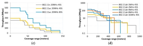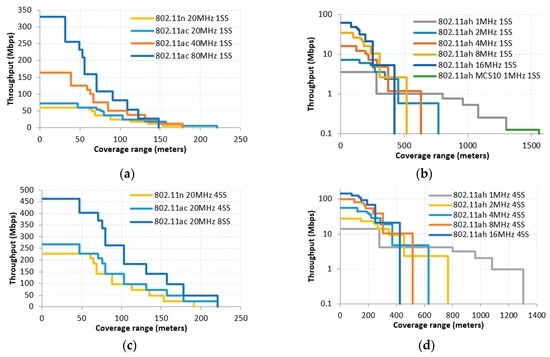 Macro deployment A-MPDU throughput vs. coverage range in IEEE 802.11: (a) shows the throughput using 1 SS for 802.11n and 802.11ac; (b) exposes the throughput for 802.11ah in 1, 2, 4, 8, 16 MHz CBW with 1 SS, highlighting the new MCS10 with 1 SS; (c) depicts the throughput using 4 and 8 SS for 802.11n and 802.11ac, respectively; (d) highlights the throughput for 802.11ah using 4 SS.