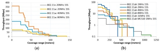 Different from Hazmi et al. [13], who utilize a Bit Error Rate (BER) model for different MCS, we use the minimum receiver sensitivity established in the proposed IEEE 802.11ah amendment (cf. Tables 23–31—Receiver minimum input level sensitivity in [2]). That is, for each distance and propagation model considered, we assume the transmitter is using the fastest available MCS, the minimum sensitivity of which is larger than the received power at that distance. For that reason Figure 2 and Figure 3 show a stepped relationship between throughput and coverage range.