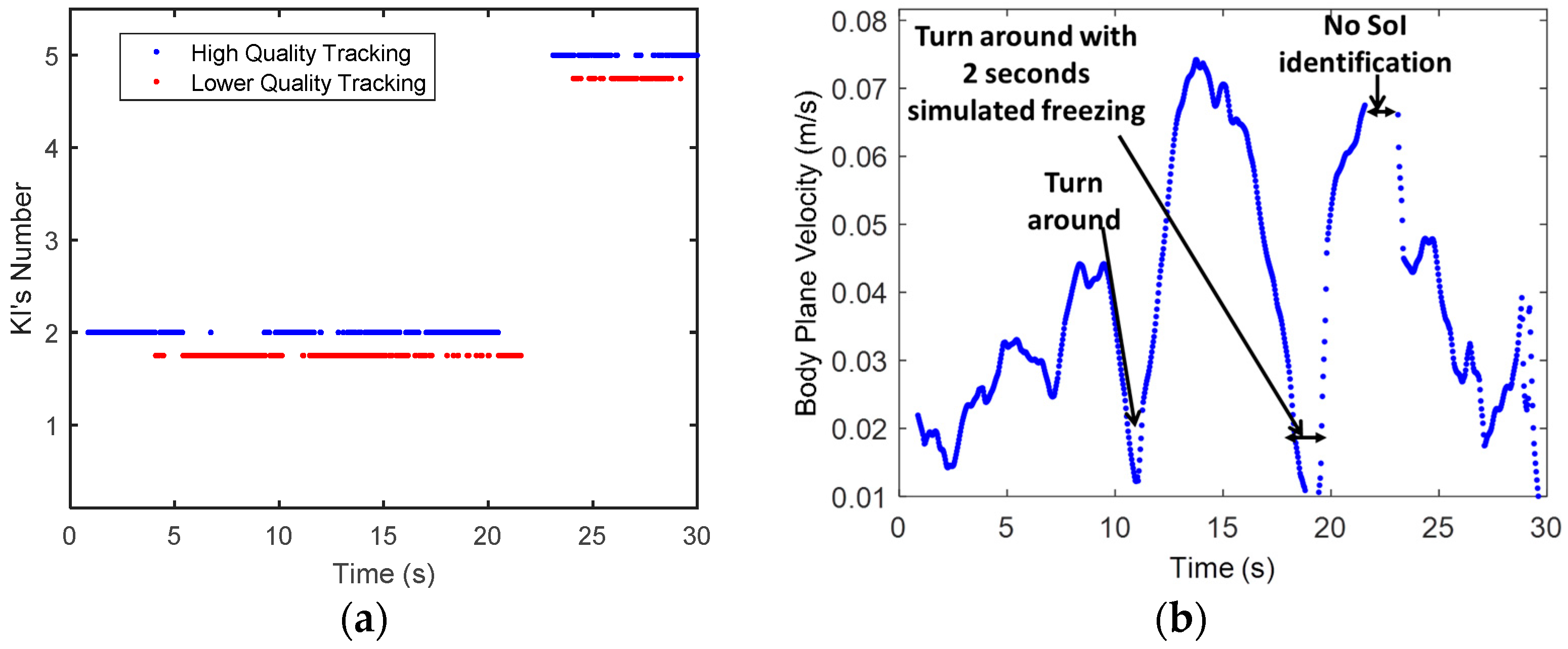 The feasibility of the new technology and the methods validation, were demonstrated in an experiment setup with three sets that represent daily activities commonly used to examine PD patients’ condition. The first experiment set included five subjects walking randomly in a room and was designed to produce statistics for the subject identification algorithm, and verify the significance of the chosen features. In this experiment, the subjects’ static features were extracted, and used to validate the capability to distinguish between the different subjects based on their signatures; the second experiment set included two subjects that maneuvered around a hall and performed different activities. It was designed to demonstrate the capabilities of the suggested methods to: (1) Detect the set of features that are used for classification; (2) identify and re-identify the SoI based on SoI’s KS from the calibration phase; (3) reject different artifacts (going in and out of the Kinect range and shadowing); (4) give indication regard the tracking quality and reliability based on skeleton distortion; and (5) validate Freezing of Gait (FOG) detection during the turnaround.