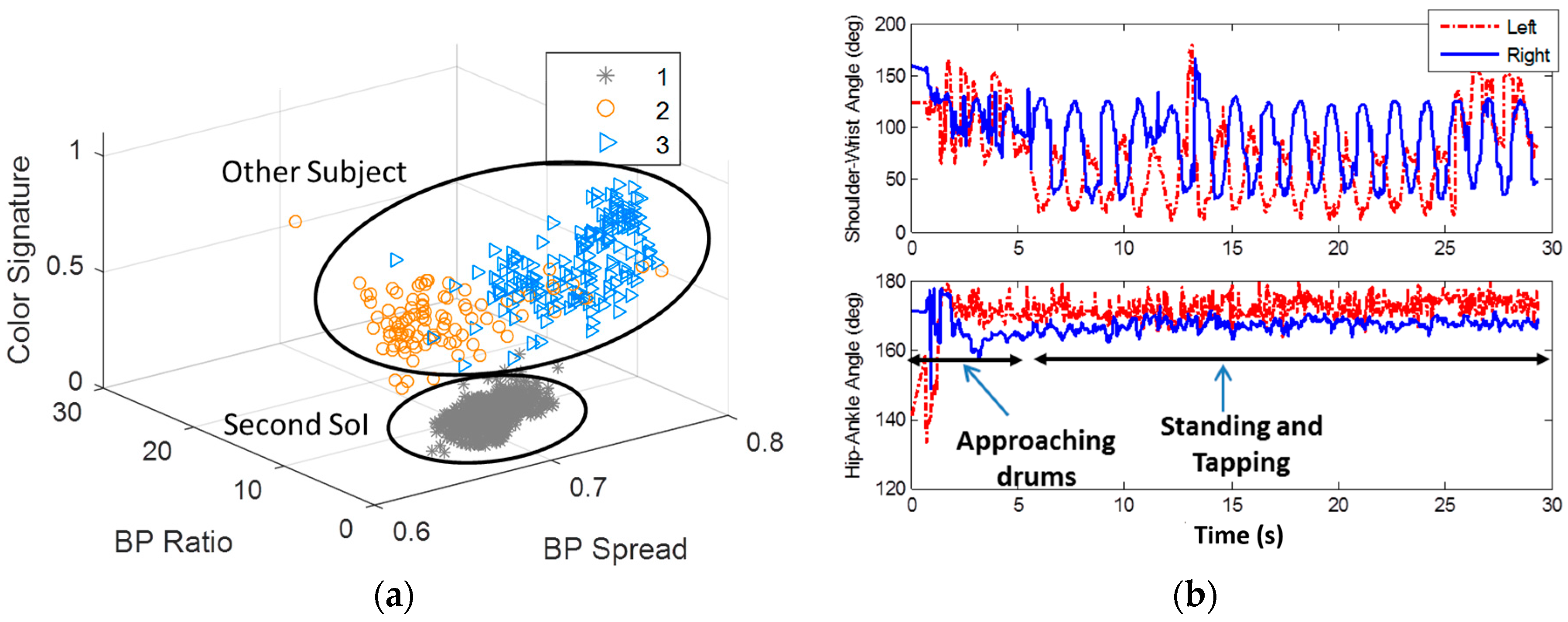 The feasibility of the suggested technology was shown by three experiment sets. In the first one, the validity of the features to identify different subjects was verified using a DFA classifier. The identification accuracy of five different subjects was around 99% with all the 34 skeleton features, and reduced to around 90% with only two skeleton features. The second experiment demonstrated the applicability of methods in a challenging environment, in which the SoI, the other subject’s KI, and a distorted skeleton, were successfully detected. It enabled merging the different SoIs’ KIs to one, and to detect and remove if needed low quality tracking features and time instances. The third experiment set demonstrated the use of dynamic features like body plane velocity and relative upper and lower limbs angles, to collect kinematic statistics for advanced kinematic analysis. Similar data analysis and implementation scheme can be tailored to the case of multiple Kinect sensors to increase coverage. The KS estimation and reliability criterion can be applied on each sensor separately, and then combined by choosing the Kinect sensor with the best subject has maximal observance. More complex approaches can be used in future to aggregate multiple Kinect sensors to single joints’ estimations.