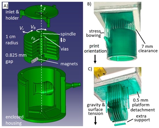 Computer design and 3D printing of µTesla. (A) The µTesla pump was comprised of three parts: cap with pivot, the rotor with vias and pockets for magnets, and the enclosed housing with fluidic spout and bottom pivot. The computer design was then printed in a DLP 3D printer. The print was upside down as pictured in (B,C) and subjected to gravity pull; (B) To reduce surface tension pulling down large areas of the enclosed housing’s bottom, substantial clearance was required along with numerous supporting posts to prevent excessive warping and detachment; (C) The rotor required extra support to keep the disks straight. Additional resin platform was added to ensure adhesion to the metal print stage.