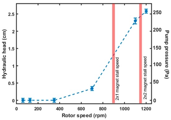 The hydraulic pressure developed by the µTesla was characterized by measuring the height of the water column that was pumped up a connected Tygon tube with 1/16” inner diameter. Tygon tubes at varying lengths were also used for subsequent flow characterizations. First, the µTesla was primed with isopropanol to reduce the bubbles trapped between the rotor disks and tubing. Then, water was injected using a 5 mL syringe from the Tygon tubes. During the characterization, it was found that the pump rotor would stall at specific speeds if there was inadequate holding force from the magnets. Therefore, single, double, and triple 0.4 lb. magnets (2 mm ∅ × 1.5 mm, McMaster-Carr, Aurora, OH, USA) were placed at opposite ends of the rotor to test the stall characteristic when the µTesla was primed with water. The results showed that two sets of 3 magnets coupled end to end were required to eliminate stalling and provide speeds up to 1200 rpm, technically limited by our stirring plate, Figure 3. Furthermore, at 1200 rpm, the maximum hydraulic head achieved was 2.6 cm, equivalent to 253 Pa of developed pressure. In comparison, a microfluidic bladed turbine required almost 4000 rpm to produce 200 Pa of pressure [36].