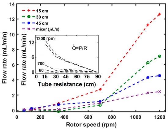 Next, the µTesla pump was loaded with increasing fluidic resistances created by varying lengths of Tygon tubing from 15 to 45 cm, and connected to a microfluidic mixer (described in Section 4). The outlet tubing or microfluidic was placed at the same level as the pump spout to eliminate pressure differences due to height. The output volume from the tubing or microfluidics was then collected directly into a microcentrifuge tube for 30 s. This volume was then quantified via manual micro pipetting and calculated for the flow rate per minute. From Figure 4, it can be seen that the flow output increased with rotor speed, but began to taper close to 1200 rpm. The maximum flow output at 1200 rpm achieved with the 15 cm tubing was 12.6 mL/min. The flow across the mixer microfluidic achieved a significantly lower rate of 0–14.6 µL/min owing to its increased fluidic resistance. At a fixed rotor speed, flow output and resistance were inversely proportional, as expected from the constant pressure generated by the pump. Extrapolating the data from the 15–45 cm tubing, the mixer device has a fluidic resistance equivalent to 90 cm of tube length, with 1.04 MPa·s/m3. This is comparable to the higher end of fluidic resistances typically found in microchannels [37].