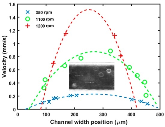 Flow profile at different pump rates. To demonstrate that the pump is able to create laminar flow in the microfluidic mixer, a 500 µm wide section of a microchannel was imaged with gold nanoparticles in the flow stream (lines in insert). With the camera integration times fixed at 100–200 ms, the streak length was calibrated and calculated to yield the flow rate across the width of the channel. Parabolic flow profiles were observed at the three rotor speeds tested.