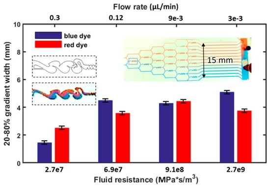 µTesla driven, Tesla-inspired mixer microfluidics. The all-Tesla-fluidic system generated gradients using blue and red dyes at flow rates as low as 3 nL/min. The mixer incorporates flow folding structures similar to Tesla valves (CAD and enlarged insert on left). The widest gradient achieved spanned 4 mm across (20%–80% intensity), as analyzed from their RGB channels in ImageJ. Errors bars denote maximum and minimum values from image analysis.