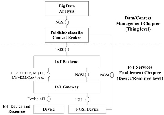 This is a cloud environment that hosts one or more of the following Generic Enablers: IoT Discovery, IoT Broker and Backend Device Management [46,50]. IoT Discovery allows device/resource discovery after registration/announcement of its availability (analogy: “yellow pages”). It also stores associations between devices/resources and the things of an IoT system. The IoT Broker interacts with the Publish/Subscribe Context Broker GE (Figure 2) and the Data Handling GE inferring the status of the things from devices/resources or vice versa through communication with IoT Discovery. Lastly, Backend Device Management allows for management of context entities associated with devices and provides several communication protocol translators (IoT agents) such as Ultralight 2.0 over Hypertext Transfer Protocol (HTTP), Message Queuing Telemetry Transport (MQTT) or OMA LWM2M/IETF Constrained Application Protocol (CoAP), among others. The IoT Backend communicates with end devices using standard protocols (MQTT [2,35], CoAP, etc.) or through the FIWARE NGSI protocol, connecting either through IoT gateway(s) and/or direct interfaces. From a more abstract point of view, beyond physical entities and computation resources, the Data/Context Management chapter defines the following Generic Enablers: