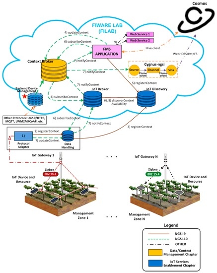 - Once entities have been defined, whether these be resources or things, any application can subscribe to the information that these entities generate by invoking the subscribeContext operation from the Context Broker. In our case the FMS application creates entities and subscribes to them, and Cosmos, which is a storage system for FIWARE Big Data, have also been subscribed to them. The Cosmos connection is not direct but rather through another FIWARE component, the injector Cygnus-NGSI. Note that there is a chain of subscriptions and brokers (Data Handling, IoT Broker and Context Broker). The most important is the Context Broker which makes things and resources accessible to applications and is the reference implementation for the system’s other brokers. The Context Broker subscribes to the context information of the IoT Broker which mediates between the Context Broker and different Data Handling associated with different areas or management zones of the crop field. The IoT Broker uses the discoverContextAvailability service of IoT Discovery in order to discover the resources associated with the things with which the Context Broker works. For our case study, all subscriptions are onChange: only events are generated and therefore notifications are sent to subscribers when changes occur in entity attributes.