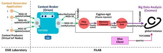 The mission of this GE is to achieve the total decoupling of producers and consumers of context information. To do this it implements the Publish/Subscribe [52] design pattern. Context producers (devices, resources and things) publish their data in this GE without needing to know who the consumers of such data are. For their part, consumers of context data do not need to know who produced it. In other words, they are simply interested in the event itself, not who generated it. As a result, the Publish/Subscribe Context Broker GE [46,51] (Context Broker hereafter) is an excellent bridge allowing external applications to manage events related to the Internet of things in a very simple way by concealing all the complexity of data compilation. To achieve this, the Context Broker uses the standard interfaces NGSI-9 and NGSI-10 which enable the recovery of said information from context producers (i.e., IoT Backend or NGSI device) to consumers of context (i.e., Big Data Analysis GE).