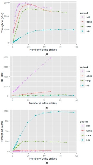 Regarding the performance of the resulting applications and based on the results obtained in the testbed, it is safe to say that the choice of payload is critical in the performance of the Orion Context Broker. As described in Section 5, an optimal payload maximises Orion’s performance in terms of throughput and latency. Furthermore, that payload allows Orion to support a greater degree of concurrency.