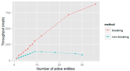 To simulate NGSI traffic generation from final IoT nodes, the non-blocking context generation method must be used so as to permit the generation of NGSI traffic in an asynchronous manner, with load peaks (bursts) that exceed the capacity of the Orion server. The purpose of this test is to measure maximum throughput in terms of requests served per second or kilobytes per second for both type of requests, blocking and non-blocking. The tests were performed with a payload of 1 kB, i.e., that which allowed simulation of the highest degree of concurrency with the blocking method. Thus, blocking and non-blocking simulations were conducted with the optimum load parameter for the blocking case. This facilitates comparisons.