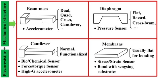 Piezoresistive sensors were one of the first developed microelectromechanical system (MEMS) devices and still display a significant growth prompted by the advancements in surface/bulk micromachining techniques and material technology [1,2,3]. Until now, silicon piezoresistances have been utilized in the detection of various targets, including acceleration [4,5,6], pressure [7,8], micro force/torque [9,10], strain/stress [11,12], flow [13,14], biochemical interaction [15,16], fluid density and viscosity [17,18], surface topography [19], sonar vectors [20], etc.