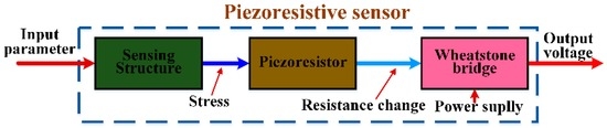 A piezoresistive sensor is a category of sensor that acquires target parameters and transforms them into piezoresistance changes. The basic principle is illustrated in Figure 2. Firstly, the input parameter acts as a kind of mechanical load onto the sensing structure and is transduced into a stress-induced resistance change of the embedded piezoresistor. Then, the resistance change is converted to an output voltage of measurement circuit, typically a Wheatstone bridge. The output voltage may be conditioned by amplifiers and acquired by a multimeter. Depending on the different targets being detected, the sensing structure varies, as mentioned in the section above.