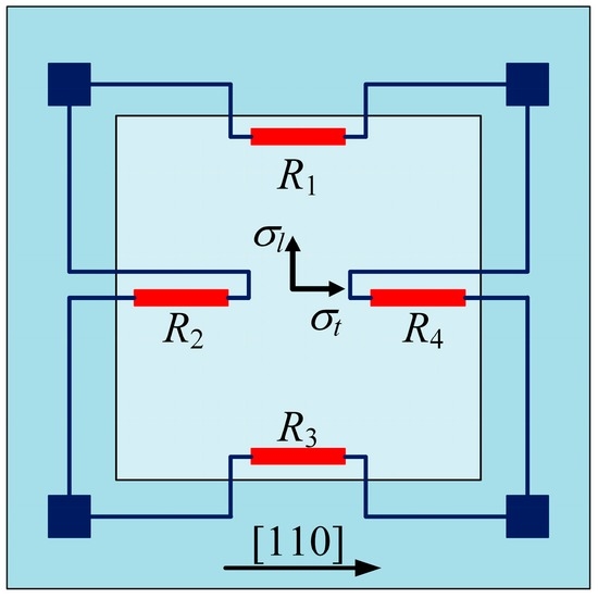 where πl, πt are the longitudinal, transverse piezoresistive coefficients, and σl, σt are the longitudinal and transverse stresses. For p-silicon piezoresistors aligned along the <110> orientation on (100) wafers, Equation (3) can be further nailed down as: