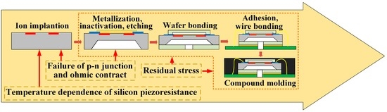Thermal-performance instability is the most ubiquitous obstruction in the application of piezoresistive sensors. The related thermal characteristics have drawn a great attention since the utilization of silicon piezoresistance in sensing devices. There are mainly three sources of performance perturbation in the fabrication and packaging of piezoresistive sensor, including temperature dependence of piezoresistive coefficient and resistance, residual stress in the passivation/metallization layers, chip adhesion and compound molding. Meanwhile, the p-n junction and ohmic contract (especially for aluminum) may fail at high temperature conditions. The instability appears from the beginning of sensor chip fabrication as illustrated in Figure 5. Each inducement features its own affection mode and intensity. Thus, it is very important for the elimination of interference effect that to get an insight into the sources of thermal-performance instability. In the following parts, the principle and affection mode of these inducements will be reviewed and summarized.