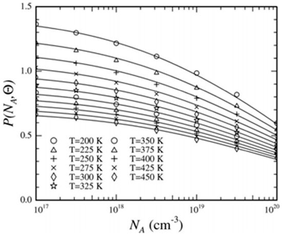 where NA is the doping concentration, Θ = T/T0 and T0 = 300 K. Other symbols in Equation (11) are the fitting items which can be found in [51], and the fitting results are shown in Figure 6 together with normalized piezocoefficient values calculated using the 6 × 6 k·p Hamiltonian model. P(NA, Θ) is larger at lower doping concentration, giving rise to a higher measurement sensitivity. Meanwhile, higher temperature dependence of P(NA, Θ) also appears, causing large temperature drift in sensitivity. At higher NA, there is a drop in the sensitivity but the P(NA, Θ) curves of different temperature tend to converge, leading to a less TCS.
