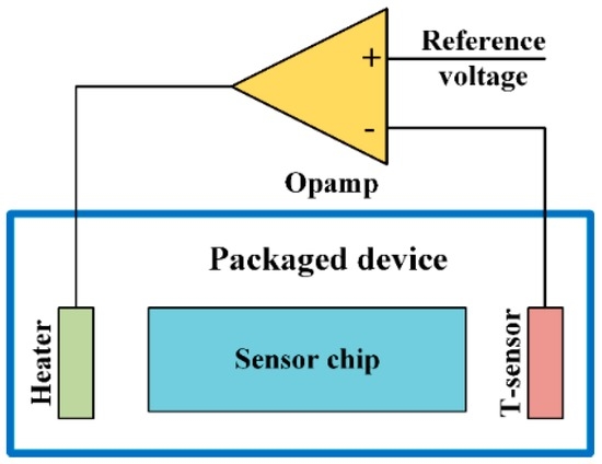 It is the temperature variation that causes most of the instabilities of sensor performance, so the influences can be eliminated if the sensor working temperature can be kept constant. This scheme needs a heater to raise the temperature, a temperature sensor (T-sensor) to monitor the real-time temperature and an amplifier to construct a closed temperature control loop. The schematic diagram of constant temperature control system can be found in Figure 8. A reference voltage is determined according to the output of T-sensor at the reference bias temperature. When the inner temperature of the device is lower than the bias one, the differential amplifier will excite the heater until the difference between the reference voltage and the output of T-sensor is balanced. If the output signal of T-sensor is equal to or higher than the reference one, the amplifier will stop the power supply. With this closed-loop system, the operation temperature of the sensor can be controlled at the bias temperature even though the ambient temperature changes. Thus, the sensor performance can be maintained over the temperature range from room temperature to the bias one. However, the bias temperature should be higher or equal to the maximum ambient temperature to ensure the system effectiveness.