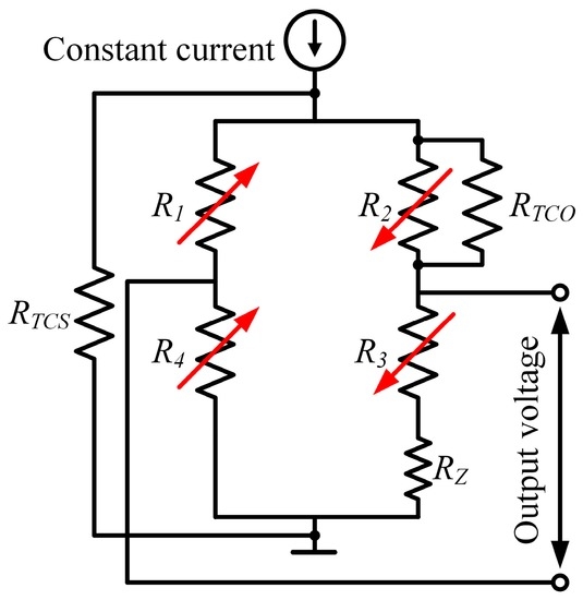 With the approximate value and mite adjustment, the zero-offset can be well controlled. If V0 > 0, Rz should be located in the bridge arm of R3 as shown in Figure 9; otherwise, Rz should be in the arm of R4. However, the compensations of TCO and TCS will incorporating other resistors and Rz is usually calculated and connected after the TCO and TCS compensations are finished. The compensation of TCO is fulfilled by paralleling a resistor RTCO at one bridge arm and its resistance can be expressed as [94]: