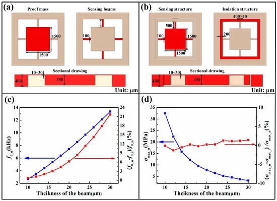 The mechanical isolation approaches, no matter whether entirely or partially isolating, may not be very applicable in the high-frequency devices. Most of the abovementioned sensors with mechanical isolation structure feature a low resonant frequency, and their static and dynamic performances are not greatly influenced. However, that situation will change if the isolation structures are incorporated into high-frequency sensors. Herein, cross-beam accelerometers with/without GR structure are modeled and simulated to study the effects from GR. The two models and their typical dimensions are depicted in Figure 11a,b. The material parameters of silicon are set as: Young’s modulus E = 166 GPa, density Δ = 2331 kg/m3 and Poisson’s ratio ν = 0.27. The applied acceleration is 50 g. f0_n is the resonant frequency of structure without GR, and f0_i is the resonant frequency of structure with GR. σmax_n is the maximum normal stress induced by the applied acceleration in the cross beams without GR (characterizing the measurement sensitivity), and σmax_i is for the beams with GR. It can be seen in the curves that the resonant frequency increases with the increment of beam thickness, but the maximum stress significantly decreases, corroborating the interdependent relationship between frequency and sensitivity. Meantime, f0_i is more and more lower than f0_n, indicating that the introduction of GR has a great influence on the dynamic characteristics. However, the difference between σmax_n and σmax_i remains at a relative small value, confirming the low impact of GR on measurement sensitivity. The utilization of GR (or other mechanical isolation structures) in high-frequency sensors needs detailed evaluation and careful design to ensure the excellent comprehensive performance of sensors.