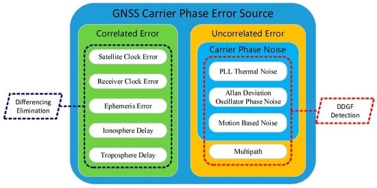 From Equation (8), it is clear that DDGF measurement is supposed to be zero and only contains carrier phase error. The residual error is actually the error difference between two frequencies. Based on that characteristic, we design the DDGF detection by comparing the DDGF measurement and its theoretical estimation. Figure 1 shows the relationship between the DDGF detection and the GNSS carrier phase error sources. The GNSS carrier phase correlated error sources, such as satellite clock error, receiver clock error, ephemeris error, ionosphere delay and troposphere delay, can be eliminated by the differencing technique. DDGF detection is done to process the uncorrelated error sources, including multipath and carrier phase noise. In this work, we divide the carrier phase noise into three parts: Phase Lock Loop (PLL) thermal noise, Allan deviation oscillator phase noise and motion-based noise. Each part is estimated separately.