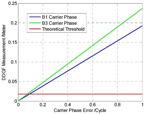 As shown in Figure 3, the green line and blue line represent how DDGF measurement changes with the B1 and B3 carrier phase error. The DDGF measurement is far larger than the theoretical threshold when large error occurs. Therefore, the performance of DDGF detection is good in case only one frequency has large carrier phase error.