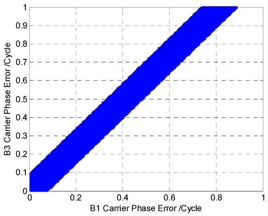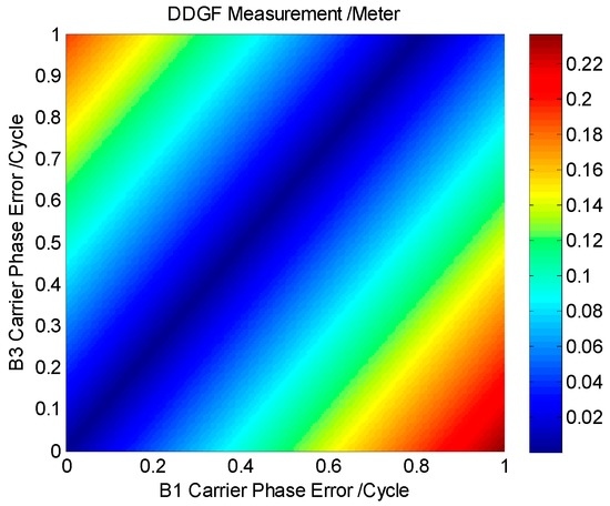 Figure 4 shows the relationship between the DDGF measurement and the carrier phase error in both frequencies. The horizontal axis is the B1 carrier phase error, and the vertical axis is the B3 carrier phase error. The carrier phase measurement originally contains integer ambiguity. The integer ambiguity cannot be initialized in case the carrier phase error is larger than one cycle. Therefore, the B1 carrier phase error and B3 carrier phase error are between zero and one. Different colors represent the magnitude of the DDGF measurement. The magnitude is small in the color of blue and large in the color of red. It is clear that there is an area in dark blue where the B1 carrier phase error and B3 carrier phase error are both large, but the DDGF measurement is small. In this area, there will be undetected error after the DDGF detection.