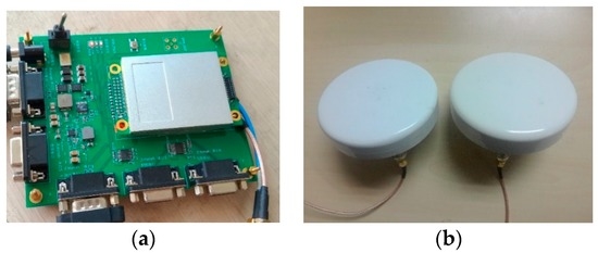 In this work, we choose B1 and B3 of BDS for the open sky test because the satellite type is various in BDS, including the Medium Earth Orbit (MEO), GEosynchronous Orbit (GEO) and Inclined GeoSynchronous Orbits (IGSO) satellites. The characteristic of all types of GNSS satellites can be analyzed. Two YWELL DY-GABR042P00D antennas and a RACOBIT OEM-B41 BDS dual frequency receiver were used. The receiver (a) and the antenna (b) are shown in Figure 6.