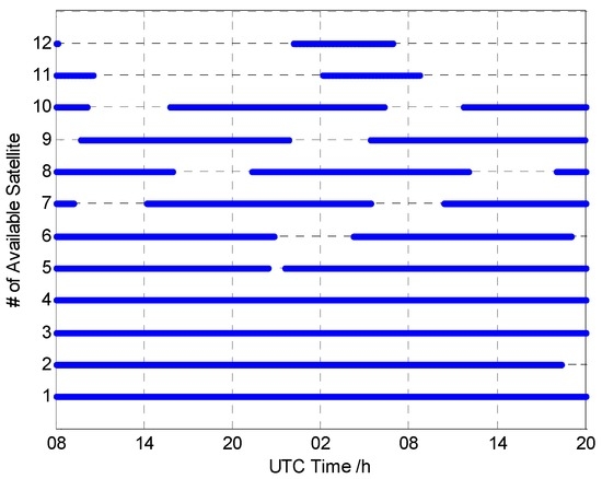 The data were collected at 0.1 Hz, with a five-degree cut-off elevation angle, from UTC time 08:02 to the next day 19:58, for a total of 12,930 epochs logged. Figure 7 shows the available satellites of the whole data. The blue line means the corresponding satellite is available. The satellites from #1 to #5 of BDS are GEO satellites. The GEO satellites are almost all available, as the GEO satellite is nearly static. The satellites from #6 to #10 of BDS are IGSO satellites. The orbit of the IGSO satellite is close to “8” at a certain longitude; hence, the IGSO satellites are available at the majority of time. The satellites #11 and #12 are MEO satellites. The orbit of the MEO satellite is global; hence, the available time is relatively short.